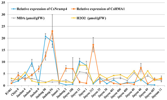 Our results showed that Cd accumulation in cucumber seedlings was positively correlated with oxidative stress indicators (Figure 1E,F), suggesting that the expression of Cd transporters might assist in the maintenance of REDOX reaction. To verify whether Cd transporters are related to the REDOX reaction induced by Cd stress in cucumber, we quantified the oxidative stress indices of the above 23 cucumber cultivars under Cd stress. Similarly, MDA and H2O2 were significantly enhanced in 23 varieties (Figure 5). The results of association analysis showed that the expression of CsNramp4 in the roots was positively correlated with oxidative stress indices in the roots (Figure 5). By contrast, the expression of CsHMA1 was negatively correlated with oxidative stress indicators in the roots (Figure 5), suggesting that CsNramp4 and CsHMA1 may maintain the REDOX balance at cytoplasmic and vacuolar levels in cucumber. The gene expression levels of CsNramp1, CsZIP1, CsZIP8, and CsHMA2 were not directly related to oxidative stress induced by Cd stress in cucumber (Supplemental Figure S9).