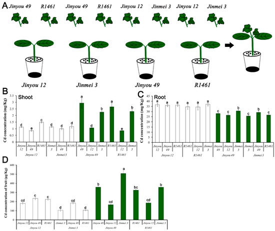 Cadmium accumulation in the roots, shoots, and fruits of cucumber with different grafting combinations exposed to Cd stress. (A) Diagram of cucumber grafting combination. (B–D) Distribution of Cd content in the shoots (B), roots (C), and fruits (D) of cucumber with different graft combinations under 0.5 μM Cd treatment. Ten-day-old cucumber plants were selected for grafting. After 7 days of growth in the vermiculite surrounded by Yamazaki nutrient solution, the live seedlings were supplemented with 0 and 0.5 μM Cd for 48 h and 4day. Vertical bars represent the standard deviation of three replicates. Different letters on the bars indicate that the mean values are significantly different between Jinyou12 lines and other combinations (p < 0.05).