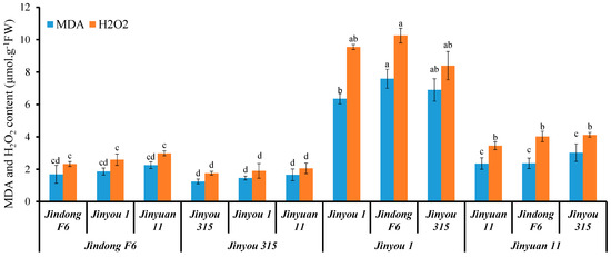 Oxidative stress level in cucumber seedlings with different grafting combinations exposed Cd stress. MDA and H2O2 content in seedlings of cucumber with different graft combinations under 0.5 μM Cd treatment. Ten-day-old cucumber plants were selected for grafting. After 7 days of growth in the vermiculite surrounded by Yamazaki nutrient solution, the live seedlings were supplemented with 0 and 0.5 μM Cd for 48 h and 4 days. Different letters on the bars indicate that the mean values are significantly different between Jinyou12 lines and other combinations (p < 0.05).