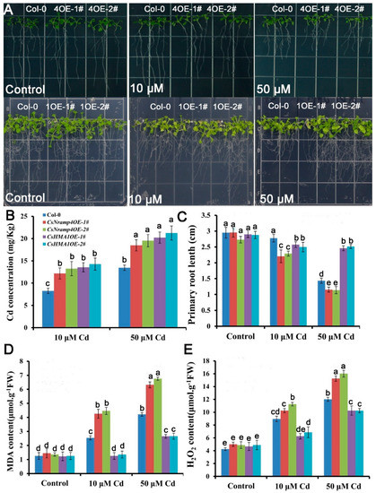 Analysis of Cd tolerance in the wild type (WT), CsNramp4 transgenic lines (UBI10:CsNramp4), and CsHMA1 transgenic lines (UBI10:CsHMA1) of Arabidopsis. (A) Phenotype of seedlings grown on 1/2 MS medium with or without 10 or 50 μM Cd for 12 d. (B) Primary root length of UBI10:CsNramp4 and UBI10:CsHMA1 transgenic seedlings grown on 1/2 MS medium with or without10 and 50 μM Cd for 12 d. (C) Cd concentrations in the shoots and roots of WT, UBI10:CsNramp4 and UBI10:CsHMA1 plants. (D,E) MDA (D) and H2O2 (E) contents of WT, UBI10:CsNramp4, and UBI10:CsHMA1 transgenic seedlings. Seedlings were grown on 1/2 MS medium with or without 10 or 50 μM Cd for 48 h. Vertical bars represent standard deviation. Different letters on the bars indicate that the mean values are significantly different between the transgenic plants and wild-type plants (p < 0.05).