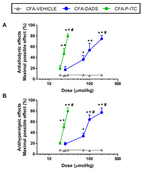 Effects of the acute intraperitoneal administration of DADS and P-ITC on the mechanical allodynia and thermal hyperalgesia induced by peripheral inflammation. Effects of different doses (logarithmic axis) of DADS and P-ITC (µmols/kg) on mechanical allodynia (A) and thermal hyperalgesia (B) induced by CFA in the ipsilateral paw of mice. For each test, * denotes significant differences vs. mice administered with vehicle, + denotes significant differences vs. mice administered with 25 µmols/kg of DADS or 18.6 µmols/kg of P-ITC, respectively, and # indicates significant differences vs. mice treated with 70 µmols/kg of DADS or 23.2 µmols/kg of P-ITC, respectively (p < 0.05; one-way ANOVA followed by Student–Newman–Keuls test). The results are shown as mean values of the maximal possible effect (%) ± SEM; n = 6 animals per dose and treatment.