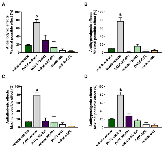 Effects of the administration of DADS or P-ITC alone or in combination with XE-991 or glibenclamide on the mechanical allodynia and thermal hyperalgesia induced by CFA. The antiallodynic (A,C) and antihyperalgesic (B,D) effects produced by DADS at 200 µmols/kg or P-ITC at 29 µmols/kg in the ipsilateral paws of mice with inflammatory pain co-treated with a Kv7 potassium channel blocker (XE-991, 12 µmols/kg), a KATP channel blocker (glibenclamide, 10 mg/kg), or vehicle are shown. For each test and treatment evaluated & indicates significant differences vs. the other groups (p < 0.05, one-way ANOVA followed by Student–Newman–Keuls test). Results are represented as mean values of the maximal possible effect (%) ± SEM values; n = 6 animals per experimental group.