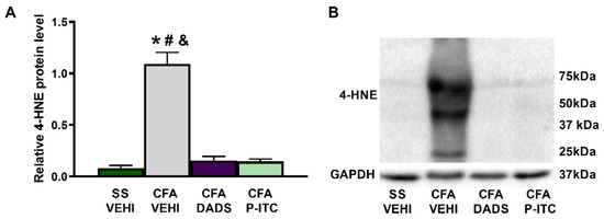 To measure the effects of DADS and P-ITC on the oxidative stress induced by CFA, we evaluated their actions in the expression of the oxidative marker 4-HNE. Our results showed an increase in the expression of 4-HNE in the paw of CFA-injected mice treated with vehicle (p < 0.0001, one-way ANOVA as compared with saline plus vehicle treated mice), which was completely reversed in DADS- or P-ITC-treated mice (Figure 4).