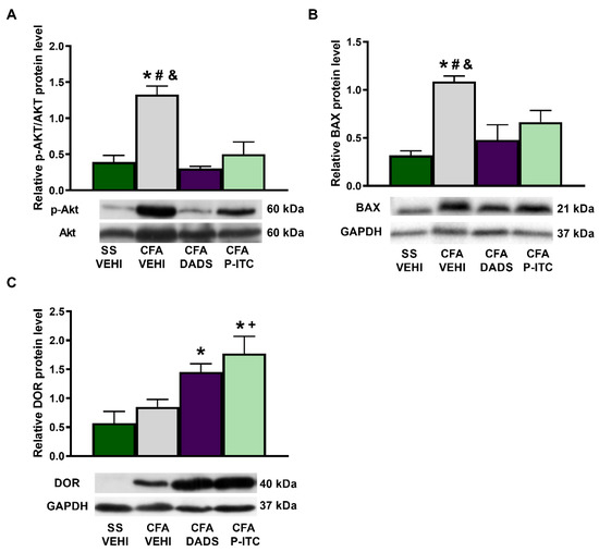 Effects of treatment with DADS and P-ITC on the expression of p-AKT, BAX, and DOR in the paw tissues of animals with peripheral inflammation. The protein levels of p-AKT/AKT (A), BAX (B), and DOR (C) in the ipsilateral paw of CFA-injected mice treated with vehicle (CFA-VEHI), DADS (CFA-DADS), or P-ITC (CFA-P-ITC) are shown. The expression of these proteins in the paw tissues of mice treated with saline + vehicle (SS-VEHI), as controls, is also shown. For each protein, * indicates significant differences when compared with saline plus vehicle-treated mice, + indicates significant differences when compared with CFA plus vehicle-treated animals, # indicates significant differences when compared with CFA plus DADS-treated mice, and & indicates significant differences when compared with CFA plus P-ITC-treated mice (p < 0.05, one-way ANOVA followed by Student–Newman–Keuls test). Representative examples of blots for p-AKT, AKT, BAX, DOR, and GAPDH are shown. Data are expressed as mean ± SEM; n = 3–4 samples.