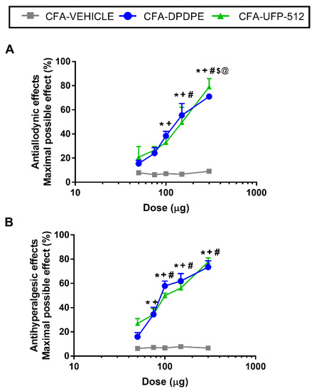Effects of the subplantar administration of DPDPE or UFP-512 in the mechanical allodynia and thermal hyperalgesia induced by peripheral inflammation. Mechanical antiallodynic (A) and thermal antihyperalgesic (B) effects of different doses (logarithmic axis) of DPDPE or UFP-512 are shown. For each dose evaluated, * indicates significant differences vs. animals treated with vehicle, + indicates significant differences vs. the effect produced by 50 μg of DPDPE or UFP-512, # denotes significant differences vs. the effect produced by 70 μg of DPDPE or UFP-512, $ indicates significant differences vs. the effect produced by 100 μg of DPDPE or UFP-512, and @ indicates significant differences vs. the effect produced by 150 μg of DPDPE or UFP-512 (p < 0.05; one-way ANOVA, followed by Student–Newman–Keuls test). Data are expressed as mean values of maximal possible effect (%) ± SEM (n = 6 animals per dose).