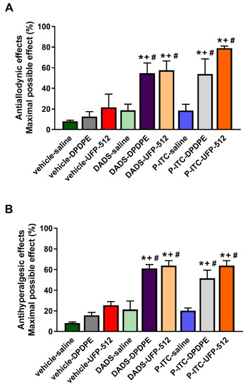 The results demonstrated that the co-administration of DADS or P-ITC with DPDPE or UFP-512 significantly enhanced the mechanical antiallodynic actions generated by both DOR agonists (p < 0.001, one-way ANOVA followed by a Student–Newman–Keuls test; as compared with their respective control groups treated with vehicle plus saline, DPDPE, or UFP-512, and with mice treated with DADS or P-ITC plus saline).