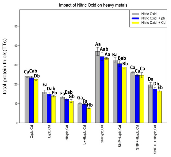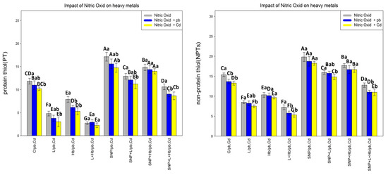 Effect of nitric oxide (NO) concentrations on protein, non-protein, and a total of thiol of A. pygmaea L. with 200 μM Pb and 200 μM Cd. The treatments contained various concentrations of nitric oxide alone or in combination with 200 μM Pb and 200 μM Cd. The capital letters showed statistically significant differences across various levels of nitric oxide alone or in combination with 200 μM Pb and 200 μM Cd (the bars with the same colors), while the lowercase letters showed statistically significant differences within each concentration of nitric oxide (NO) alone or in combination with 200 μM Pb and 200 μM Cd (the bars with different colors) according to Tukey’s test (p < 0.05).