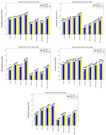Effect of nitric oxide (NO) concentrations on hydrogen peroxide (H2O2), superoxide radical (O2•−), soluble proteins (SP), lipid peroxidation (MDA), and electrolyte leakage (EL) of A. pygmaea L. with 200 μM Pb and 200 μM Cd. The treatments contained various concentrations of nitric oxide alone or in combination with 200 μM Pb and 200 μM Cd. The capital letters showed statistically significant differences across various levels of nitric oxide alone or in combination with 200 μM Pb and 200 μM Cd (the bars with the same colors), while the lowercase letters showed statistically significant differences within each concentration of nitric oxide (NO) alone or in combination with 200 μM Pb and 200 μM Cd (the bars with different colors) according to Tukey’s test (p < 0.05).