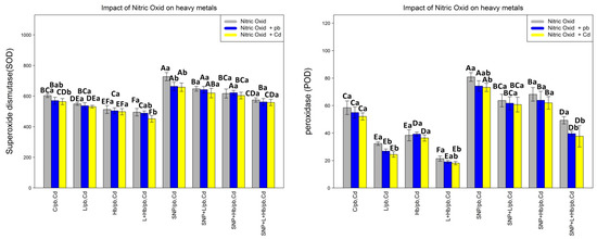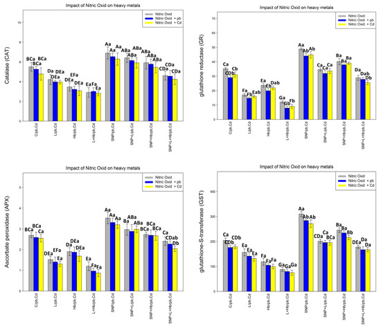 Effect of nitric oxide (NO) concentrations on antioxidant enzyme activities (SOD, POD, CAT, GR, APX and GST), of A. pygmaea L. with 200 μM Pb and 200 μM Cd. The treatments contained various concentrations of nitric oxide alone or in combination with 200 μM Pb and 200 μM Cd. The capital letters show statistically significant differences across various levels of nitric oxide alone or in combination with 200 μM Pb and 200 μM Cd (the bars with the same colors), while the lowercase letters show statistically significant differences within each concentration of nitric oxide (NO) alone or in combination with 200 μM Pb and 200 μM Cd (the bars with different colors) according to Tukey’s test (p < 0.05).