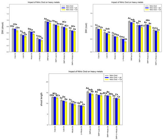 Effect of nitric oxide (NO) concentrations on bamboo biomass (DW shoot and DW root) and shoot length of A. pygmaea L. with 200 μM Pb and 200 μM Cd. The treatments contained various concentrations of nitric oxide alone or in combination with 200 μM Pb and 200 μM Cd. The capital letters showed statistically significant differences across various levels of nitric oxide alone or in combination with 200 μM Pb and 200 μM Cd (the bars with the same colors), while the lowercase letters showed statistically significant differences within each concentration of nitric oxide (NO) alone or in combination with 200 μM Pb and 200 μM Cd (the bars with different colors) according to Tukey’s test (p < 0.05).