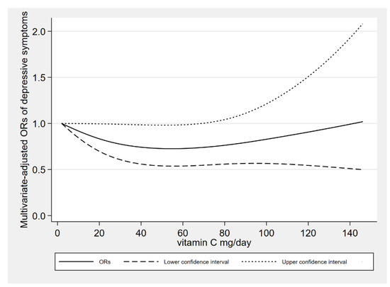 A previous study among male students aged 18–35 in New Zealand [14] showed that vitamin C levels were negatively correlated with depression. Another study [15] found that the intake of vitamin C in Japanese elderly people’s diet was negatively correlated with the risk of depression symptoms. It was also found that vitamin C supplementation was significantly related to a decreased depression score in depressed shift workers in an oil refinery [16]. However, a study on the elderly Merseyside residents over 60 years of age living in residential homes [17] did not find the association between vitamin C supplementation and the improvement of depressive symptoms.