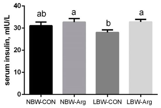 Effects of L-arginine supplementation on serum insulin concentration in suckling piglets with different birth weights. Values are expressed as mean with their SEM, n = 10/group. Means without a common letter differ, p < 0.05. Arg, a diet supplemented with 1.0% L-arginine; CON, a diet not supplemented with L-arginine; LBW, low birth weight; NBW, normal birth weight.