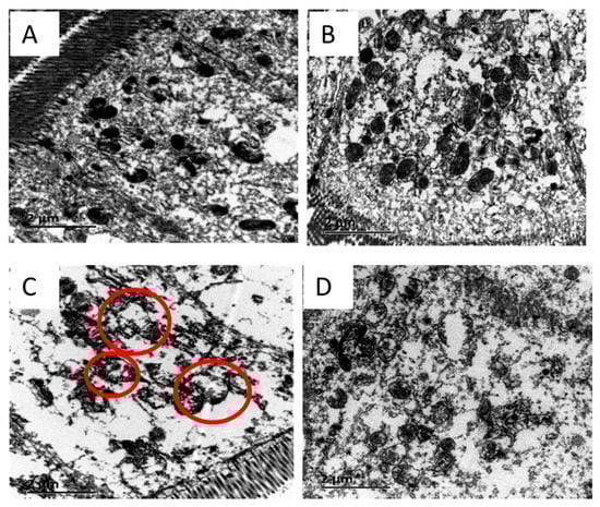 Effects of dietary L-arginine supplementation on jejunum mitochondrial morphology in piglets with different birth weights. (A), normal birth weight piglets fed a diet not supplemented with L-arginine; (B), normal birth weight piglets fed a diet supplemented with 1.0% L-arginine; (C), low birth weight piglets fed a diet not supplemented with L-arginine (red circle: the typical swollen and vacuolar mitochondria); (D), low birth weight piglets fed a diet supplemented with 1.0% L-arginine.