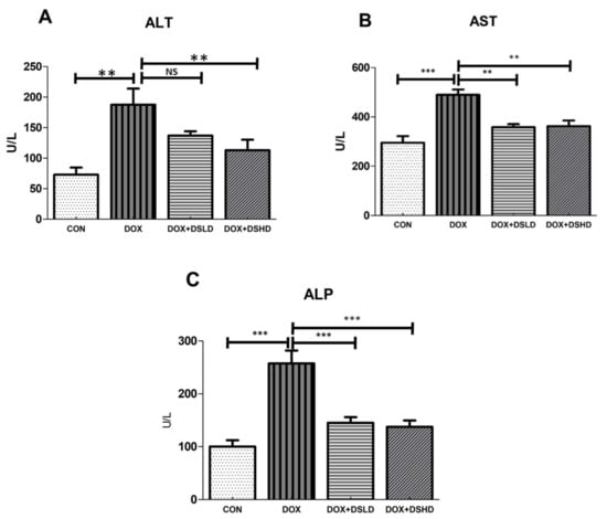 Effects of diosmin pretreatment on serum levels of ALT (A), AST (B), and ALP (C) in male Wistar rats exposed to DOX. DOX increased ALT, AST, and ALP, and diosmin attenuated these effects at both lower and higher dose. Error bars represent the mean ± SD (n = 5), where *** p < 0.001, ** p < 0.01, and NS p > 0.05. CON, control group; DOX, doxorubicin group; DOX + DSLD, group of doxorubicin and diosmin 100 mg/kg; DOX + DSHD, group of doxorubicin and diosmin 200 mg/kg.