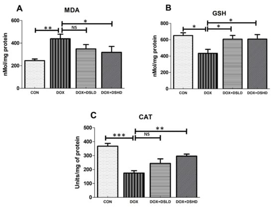 Effects of diosmin pretreatment on oxidative stress markers, such as MDA (A), GSH (B), and CAT (C), in male Wistar rats exposed to DOX. Diosmin diminished the oxidative stress induced by DOX. DOX increased MDA and decreased GSH and CAT, and diosmin attenuated these effects at both lower and higher dose. Error bars represent the mean ± SD, where *** p < 0.001, ** p < 0.01, * p < 0.05, and NS p > 0.05. CON, control group; DOX, doxorubicin group; DOX + DSLD, group of doxorubicin and diosmin 100 mg/kg; DOX + DSHD, group of doxorubicin and diosmin 200 mg/kg.