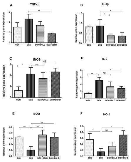 (A–F) Effects of diosmin pretreatment on the gene expression of inflammatory and antioxidants genes. Data are presented as mean ± SD (n = 3), where ** p < 0.01, * p < 0.05 and NS p > 0.05. CON, control group; DOX, doxorubicin group; DOX + DSLD, group of doxorubicin and diosmin 100 mg/kg; DOX + DSHD, group of doxorubicin and diosmin 200 mg/kg.