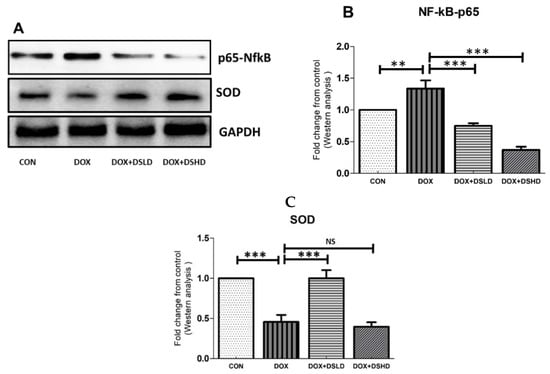 Effects of diosmin pretreatment altered the level of protein expression of p65-NFkB and SOD. (A) Immunoblot representation of p65-NFkB and SOD; (B,C) graphical representation of p65-NFkB and SOD. Error bars represent the mean ± SD (n = 3). *** p < 0.001, ** p < 0.01, and NS p > 0.05. CON, control group; DOX, doxorubicin group; DOX + DSLD, group of doxorubicin and diosmin 100 mg/kg; DOX + DSHD, group of doxorubicin and diosmin 200 mg/kg.
