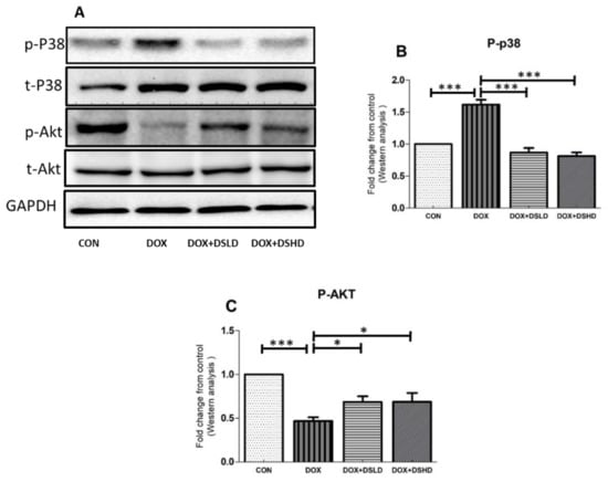 Effects of diosmin pretreatment on altered the level of p38- and pAKT-mediated apoptosis cascade. (A) Immunoblot representation of p38 and pAKT; (B,C) graphical representation of p38 and pAKT. Error bars represent the mean ± SD (n = 3). *** p < 0.001 and * p < 0.05. CON, control group; DOX, doxorubicin group; DOX + DSLD, group of doxorubicin and diosmin 100 mg/kg; DOX + DSHD, group of doxorubicin and diosmin 200 mg/kg.