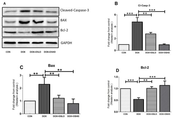3.4. Effect of Diosmin against DOX-Induced Activation of Apoptotic Pathways