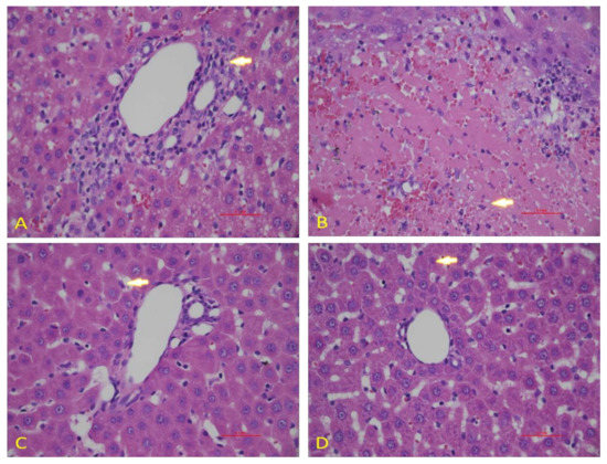 Effects of diosmin pretreatment on light micrographs of the H & E stain liver tissues of 0.1 mm. (A) The normal tissue of the liver. (B) Irregular architecture of liver tissues caused by Dox administration appeared, as indicated by arrows. (C,D) Diosmin pre-treatment reduced harmful effects of Dox in cytoplasmic vacuoles, necrotic hepatocytes, and vascular congestion at both doses.