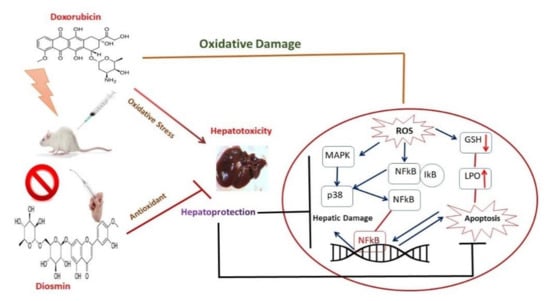 Data from the current study confirmed for the first time the hepatoprotective effect of diosmin against DOX-induced liver damage. Diosmin could be a potent regulator against DOX-induced liver injury. Our findings revealed that DOX significantly decreased hepatic antioxidant machinery, increased serum enzymatic activities, and disturbed the inflammatory and apoptotic-mediated signaling pathways. Importantly, diosmin pre-treatment restored DOX-induced oxidative stress and hepatotoxicity. The results support the implementation of diosmin for human consumption to fight against oxidative stress and its linked impairment. Further studies are necessary to fully understand the protective effects of diosmin against DOX-induced toxicity involving other potential signaling pathways. Further investigations should also establish an experimental schedule and/or formulation of such nutraceuticals against chemotherapeutics at other cellular and subcellular levels. The development of hepatoprotective compounds, including diosmin targeting the cellular compartment, delivers hope for future therapeutic interventions for various hepatic disorders (Figure 8). Nevertheless, one of the limitations of the present study is that we did not use inhibitors or knock-out models to inhibit the molecular mechanisms involved in doxorubicin-induced hepatotoxicity to validate the hepatoprotective effect of diosmin. However, the results of the current study shed light on the hepatoprotective effect of diosmin and would foster further studies to further prove the current findings.