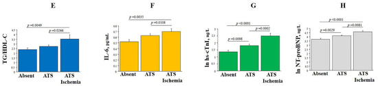 Patients were subdivided into groups according to the absence of atherosclerosis and myocardial ischemia, and the presence of atherosclerosis either alone or combined with myocardial ischemia. Comparison of clinical and bio-humoral features among these groups are reported in Tables S3 and S4 of Supplementary Materials. Patients with coronary atherosclerosis plus ischemia had significantly higher levels of HO-1 as compared with patients without any disease or with only atherosclerosis (Figure 2A). They had also higher levels of HOMA-IR index, BMI, TG/HDL-C ratio and lower of HDL-C (Figure 2B–E) as well as higher levels of IL-6 (Figure 2F), hs-cTnI and NT-proBNP (Figure 2G,H).