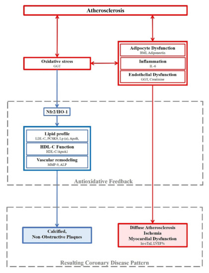 The results of the present study in patients with CCS are framed according to a possible pathophysiologic diagram where “high HO-1” plasma levels reflect a compensatory response to an unbalanced redox state that stimulates Nrf2 activation and HO-1 production. In this context, a higher oxidative stress is putatively linked to adipocyte and endothelial dysfunction, as well as inflammation, all of which are factors that may contribute to the development of atherosclerosis and predispose to ischemia and myocardial dysfunction. On the other hand, higher oxidative stress may stimulate the Nrf2/HO-1 pathway with a potential protective feedback, causing reduction in cholesterol levels, less vascular remodeling, and improvement of cholesterol efflux. The final effect on coronary artery disease pattern would translate into a more diffuse coronary atherosclerosis, mainly with non-obstructive and calcified plaques, together with higher predisposition to myocardial ischemia and dysfunction.