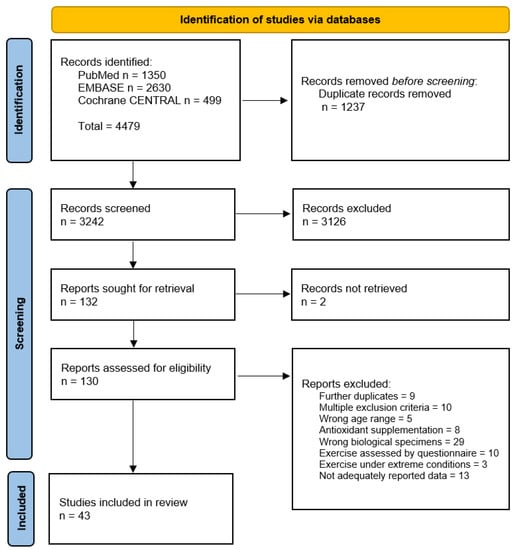 Systematic reviews, scoping reviews, case studies, editorials, conference papers/abstracts and all primary research reporting non-quantitative data, based on animal or in vitro experiments, with an ecological design, were excluded. Moreover, studies involving any kind of antioxidant supplementation, non-objectively assessing physical activity (e.g., questionnaire), including physical activity performed under extreme conditions (e.g., high altitude) were excluded.