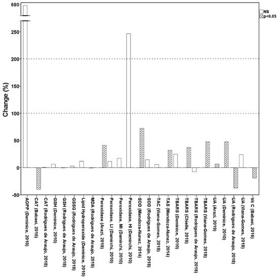 Salivary biomarkers of oxidative stress according to the studies included in the systematic review. Note: Data are reported as percentage changes after physical activity interventions and according to the significance level (i.e., NS = not significant). HI = high intensity of physical activity; MI = moderate intensity of physical activity; LI = low intensity of physical activity.