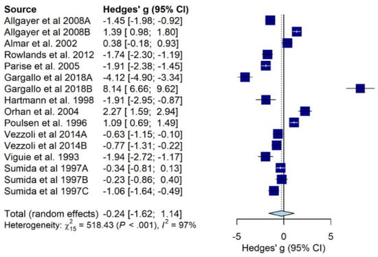 Substantial heterogeneity was detected in both meta-analyses (I2 = 97%, p < 0.001; I2 = 98%, p < 0.001, respectively). Refs. [36,52] were identified as outliers and removed from DNA oxidation products meta-analysis and, although the heterogeneity remained very high (I2 = 95%, p < 0.001), physical activity was significantly associated with the decrease of 8-oxo-dG or 8-OH-dG (−0.68, 95% CI from −1.37 to 0.00). We explored the contribution of each study to the overall heterogeneity, detecting that [27,53,54] contributed the most in the meta-analysis on DNA oxidation products and [42] in the meta-analysis on isoprostanes. However, the subsequent leave-one-out analysis did not show any significant reductions in heterogeneity, even after removing those studies identified as greater contributors in terms of heterogeneity. No publication bias was found in any meta-analyses (p = 0.88 and p = 0.44, respectively) (Figures S1 and S2 in the supplementary material). Finally, several meta-regressions were carried out accounting for the potential effect of other predictors.