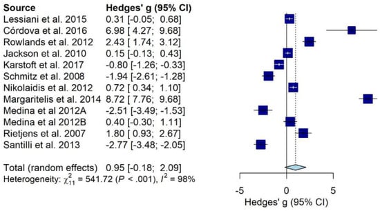 To estimate the pooled effect of the physical activity intervention on oxidative stress biomarkers a random-effect meta-analytic model with the DerSimonian–Laird estimator (inverse variance method) was used. The average effect size and a 95% Confidence Interval (CI) were computed by the Jackson method. The heterogeneity among the studies was inspected by the Cochran’s Q test and the Higgins I2 statistics.