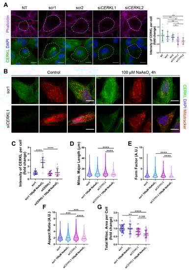 Due to genetic and environmental factors, the retina, including RPE, is constantly under stress conditions that may damage mitochondrial network organization if resilience mechanisms do not work properly []. To assess CERKL function in regulating the morphology of the mitochondrial network in retinal epithelium cells, we knocked down CERKL expression in human ARPE-19 cells using siCERKL1 under basal and oxidative stress conditions (100 μM sodium arsenite for 4 h) and studied mitochondrial morphology through the fluorescent mitochondrial tracker Mitotracker (Figure 2B). In accordance with previous studies, a pool of CERKL localizes at the mitochondria. Remarkably, CERKL total expression is significantly induced in ARPE-19 cells under oxidative stress conditions. Notably, this sodium arsenite-dependent boost expression of CERKL is completely impaired when CERKL is downregulated by siCERKL1 (Figure 2C).