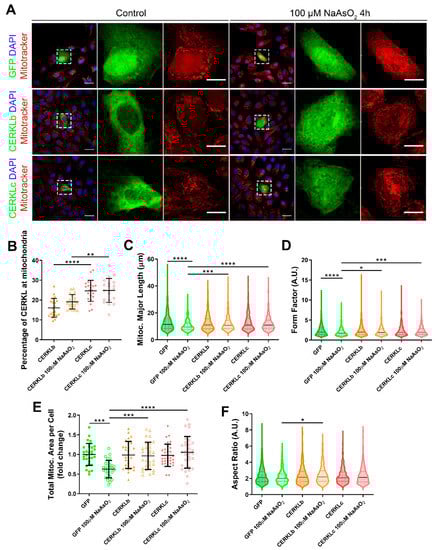Morphological analyses showed a statistically significant decrease in mitochondrial major length, area, and form factor in GFP-transfected cells (controls) under oxidative stress compared with in the basal condition. However, mitochondria in cells transfected with both CERKLb and CERKLc did not show any significant change in these parameters between basal and oxidative stress conditions. In fact, the mitochondrial length, area, and form factor in CERKLb and CERKLc-transfected cells under stress conditions were not affected in contrast with the decrease in all these measurements in stressed control cells (Figure 3C–F).