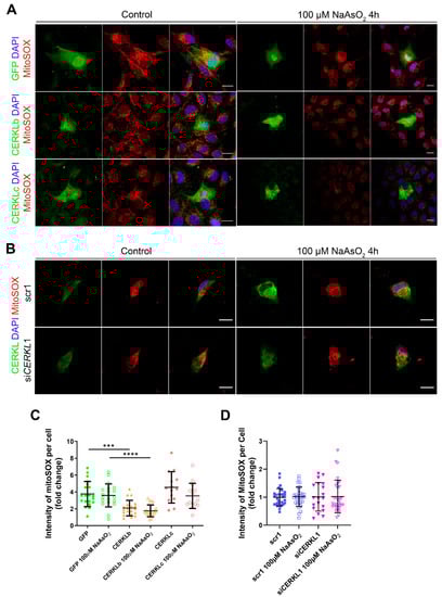 Mitochondrial network disorganization is a typical sign of cellular damage and loss of mitochondrial homeostasis []. Under oxidative stress or pathogenic conditions, damaged mitochondria generate free radicals, such as mitochondrial superoxide, due to impaired antioxidant response []. Therefore, we measured mitochondrial oxidation using MitoSOX quantification in cells either overexpressing CERKLb and CERKLc or depleted in CERKL expression under both control and oxidative stress conditions (Figure 4A,B). A significant decrease in MitoSOX intensity was observed when overexpressing CERKLb and CERKLc in basal conditions, and this mitochondrial protection was maintained under oxidative stress (Figure 4C). On the other hand, neither control cells nor cells depleted in CERKL showed an increase in MitoSOX in any condition, thus pointing to other factors being necessary for mitochondrial superoxide production besides stress by sodium arsenite (Figure 4D).