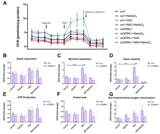 Oxygen consumption is impaired in CERKL-depleted ARPE-19 cells under different antioxidant (NAC pre-treatment) and oxidative stress (NaAsO2 treatment) conditions. (A) Altered oxygen consumption rate (OCR) in CERKL-knocked-down cells in all conditions; straight lines indicate values from scrambled control cells, whereas dotted lines indicate siCERKL treated cells. (B) Basal respiration are the initial OCR levels without treatment. (C) Maximal respiration is obtained after the addition of FCCP (carbonyl cyanide-4-trifluoromethoxy phenyl-hydrazone). (D) Spare capacity is calculated by subtracting basal respiration from maximal respiration. Note that CERKL-depleted cells neither increase the respiratory capacity after antioxidant treatment nor maintain maximal respiration and spare capacity after oxidative injury. Oligomycin addition reveals (E) ATP production and (F) proton leak levels. (G) Non-mitochondrial oxygen consumption values are obtained after rotenone and antimycin A addition. Statistical test by two-way ANOVA: ** p-value ≤ 0.01, *** p-value ≤ 0.001.