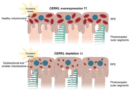 Image depicting the effects of CERKL overexpression and depletion in mitochondrial shape and size in RPE cells upon oxidative stress conditions. Under oxidative stress, CERKL overexpression (upper panel) protects RPE mitochondrial morphology, whereas depletion in CERKL (lower panel) causes mitochondrial fragmentation, respiratory alterations, and polynucleation in RPE. Dysfunction of RPE affects photoreceptor homeostasis and can lead to retinal degeneration. Blue—nuclei; brownish red—healthy mitochondria; brown—dysfunctional and smaller mitochondria.