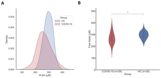 (A) Kernel density estimation of the distributions of serum free thiol concentrations among subjects with mild COVID-19 and healthy controls, demonstrating a normal distribution in both groups. Density estimates were performed using a Gaussian kernel. (B) Baseline serum concentrations of free thiols (µM) are significantly reduced in subjects with mild COVID-19 as compared to healthy controls (* p = 0.014).