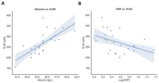 (A) Serum CRP concentrations are inversely associated with serum free thiol concentrations (R-SH) (St. β = −0.434, p = 0.027) in mild COVID-19 subjects. (B) Serum albumin is positively associated with serum free thiol concentrations (R-SH) (μM) (St. β = 0.710, p < 0.001) in mild COVID-19 subjects.