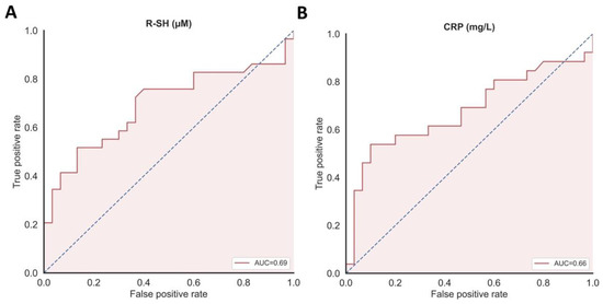 (A) Serum concentrations of free thiols (µM) significantly discriminated between patients with COVID-19 and healthy controls and (B) showing a slightly higher discriminative capacity as compared to CRP concentrations (mg/L).