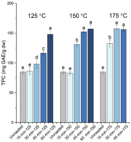 The total polyphenolic content (TPC) of the carob powder extracts obtained prior to (unroasted) and after the roasting of kibbles at 125 °C (for 15, 30, 45 and 60 min), 150 °C (for 15, 30, 45, 60 min) and 175 °C (for 15, 30, 45 min). The different letters show the statistically significant differences according to Tukey’s honestly significant difference (HSD) test at p < 0.05.
