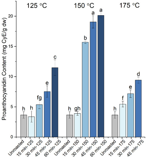 To investigate the effect of roasting on different polyphenolic compounds, we also photometrically determined the proanthocyanidin content of the extracts from raw and roasted carob kibbles. Figure 2 shows the changes in the proanthocyanidin content of the extracts from carob powder upon roasting at the indicated times and temperatures. Similar to the TPC, the lowest content in proanthocyanidins was recorded for the extract from the raw carob powder at the value of 3.6 mg CyE/g dw. The proanthocyanidin content increased with the roasting time, reaching a maximum at 60 min and, specifically, a value of 11.5 mg CyE/g dw at 125 °C (3.2-fold increase), 20.1 mg CyE/g dw at 150 °C (5.5-fold increase) and 9.4 mg CyE/g dw at 175 °C (2.6-fold increase). Therefore, the data revealed that varying maximum proanthocyanidin content can be obtained at different roasting temperatures, with 150 °C being the optimum temperature for enhancing the content of extracts. Overall, we suggest that roasting enhances the solubility and extractability of proanthocyanidins, while the competing thermal degradation of proanthocyanidins can be responsible for the lower values observed at 175 °C in comparison to 150 °C.