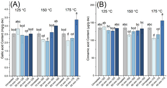 (A) Gallic acid and (B) cinnamic acid contents of the carob powder extracts obtained prior to (unroasted) and after the roasting of kibbles at 125 °C (for 15, 30, 45 and 60 min), 150 °C (for 15, 30, 45 and 60 min) and 175 °C (for 15, 30 and 45 min). The different letters show the statistically significant differences according to Tukey’s HSD test at p < 0.05.