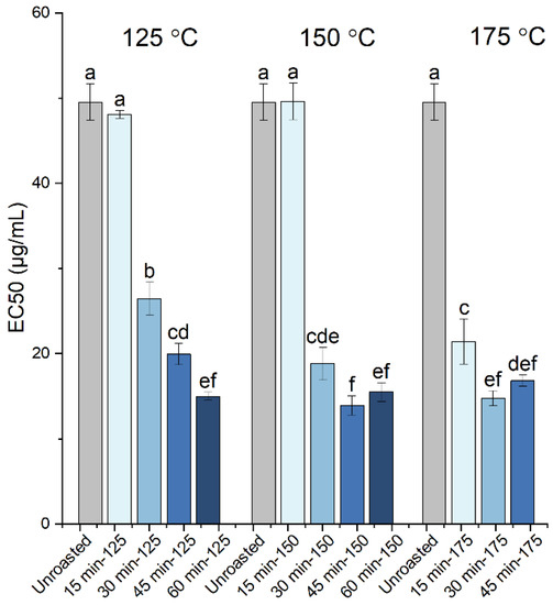 DPPH scavenging activity (expressed as EC50) of the carob powder extracts obtained prior to (unroasted) and after roasting of kibbles at 125 °C (for 15, 30, 45 and 60 min), 150 °C (for 15, 30, 45 and 60 min) and 175 °C (for 15, 30 and 45 min). The different letters show the statistically significant differences according to Tukey’s HSD test at p < 0.05.