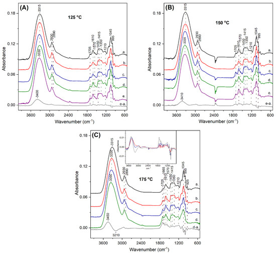 ATR-FTIR spectra of carob powder extracts obtained prior to (trace a) and after the roasting of kibbles for 15 min (trace b), 30 min (trace c), 45 min (trace d) and 60 min (trace e) at the indicated temperatures in each panel: (A) 125 °C, (B) 150 °C and (C) 175 °C. The spectra in all panels have been translated along the vertical axis for clarity. The difference FTIR spectrum of the extract from the longer roasting time minus the unroasted sample (trace e−a in panels (A,B) and trace d−a in panel (C)) is included in all panels. The inset in panel (C) shows the FTIR difference spectra: b−a (red), c−a (blue) and d−a (grey) in an overlay plot.