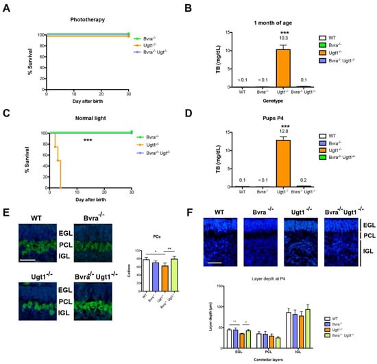 To determine possible neurological damage, mice were sacrificed at postnatal day 4 (P4), and brain and blood were collected. Plasma bilirubin level at P4 in the Bvra−/−Ugt1−/− animals were 0.2 mg/dL, comparable to that in WT mice (0.1 mg/dL), and, as expected, very high in the Ugt1−/− animals and not detectable in the Bvra−/− mice (Figure 1D). Brain histology at P4 showed no abnormalities in the Bvra−/− and Bvra−/−Ugt1−/− groups (Figure 1E,F), while the Ugt1−/− animals presented important cerebellar abnormalities, with a significant decrease in the depth of the external germinal layer and in the number of Purkinje cells, in line with previously reported data of P5 pups [].