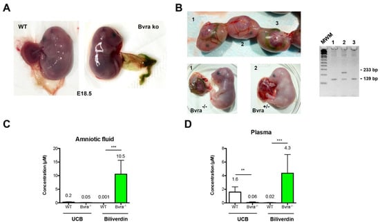 However, the presence of Bvra in the placenta suggests a role related to heme turn-over in the gestational phase [,]. In order to shed light to this issue, the effect of Bvra absence in the placenta and embryos was investigated. Breeding of Bvra+/− or Bvra−/− females with Bvra−/− males was set up and embryos and placentas were analyzed at embryonic day 18.5 (E18.5). All Bvra−/− embryos, and especially the placenta, had a readily recognizable greenish color irrespective of the presence or absence of Bvra in the mother (Figure 2A,B). Analysis of the amniotic fluid and plasma demonstrated the presence of biliverdin only in Bvra−/− embryos, but not in wild-type embryos (Figure 2C,D). Bilirubin (~2 µM) was present in the plasma but not in the amniotic fluid of wild-type embryos. The total amount of heme metabolites in Bvra-deficient embryos (10 µM biliverdin in the amniotic fluid and 4 µM in plasma) was significantly higher compared to that of WT embryos (2 µM bilirubin in plasma only), indicating that the conversion of biliverdin to bilirubin indeed results in a more efficient clearance from the embryo into the maternal circulation.