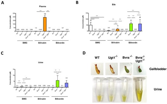 Bilirubin and biliverdin in plasma, bile, and urine. Bilirubin monoglucuronide (BMG), bilirubin and biliverdin in plasma (A), gall bladder bile (B), and urine (C) in middle-aged (9-months-old) mice. Data represent the mean ± SD (n = 5/gender/genotype; both genders are plotted together). The mean of each group is indicated above each respective bar. One-way ANOVA. Plasma: BMG, p ≤ 0.0001, F = 12.59; bilirubin, p ≤ 0.0001, F = 622.8; Biliverdin, p ≤ 0.0001, F = 86.22. WT vs. Bvra−/−Ugt1−/−, ns (is indicated for BMG, bilirubin, and biliverdin). Bile: BMG, p ≤ 0.0001, F = 43.31; bilirubin, p ≤ 0.0001, F = 36.18; Biliverdin, p ≤ 0.0001, F = 32.00. WT vs. Bvra−/−Ugt1−/−: p ≤ 0.001; ns; p ≤ 0.001 BMG, bilirubin, and biliverdin, respectively). Urine: BMG, p = 0.006, p = 10.10; bilirubin, p = 0.6433, F = 0.5662, ns; biliverdin, p = 0.0009, F = 9.260. WT vs. Bvra−/−Ugt1−/−, ns (is indicated for BMG, bilirubin, and biliverdin). Bonferroni tests: *, p ≤ 0.05; **, p ≤ 0.01; ***, p ≤ 0.001. (D) Representative pictures of gallbladder (upper panels) and urine (lower panels) of WT, Bvra−/−, Ugt1−/− and Bvra−/−Ugt1−/− mice.