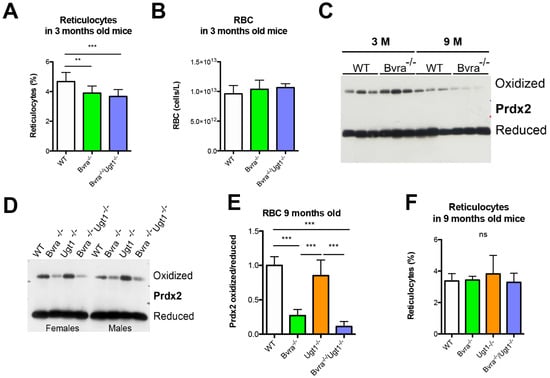 This putative prolonged exposure to systemic oxidative stress coincided with the increased levels of oxidized peroxiredoxin 2 (Prdx2), one of the major proteins of red blood cells and an established marker for oxidative stress in erythrocytes, seen in both young Bvra-deficient strains (Figure 4C and Figure S5), and as reported previously []. Unexpectedly, in 9-month-old mice the ratio of oxidized vs. reduced Prdx2 in both Bvra−/− and Bvra−/−Ugt1−/− mouse strains was significantly decreased compared to WT and Ugt1 deficient mice in both males and females (Figure 4D,E and Figure S5). This seems to indicate compensation of systemic oxidative stress during aging in Bvra deficiency. The comparable percentages of all other cells in the blood of these older mice also did not provide an indication of a potential mechanism (Figure 4F and Figure S4).