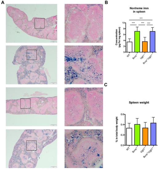 Iron accumulation in spleen from Bvra−/− and Bvra−/−Ugt1−/− 9-months-old mice. (A) Representative images of Prussian blue staining revealed iron deposition in the spleen of 9-months-old Bvra−/− and Bvra−/−Ugt1−/− mice. The boxed areas are shown at higher magnification in the right hand side of the panel. Scale bar 50 μm; (B) quantification of non-heme iron extracted from the spleen. One-way ANOVA, p ≤ 0.0001, F = 22.29; Bonferroni tests: ***, p ≤ 0.001; WT vs. Bvra−/−Ugt1−/−: p ≤ 0.001; (C) spleen weight of 9-month-old mice, normalized by body weight. One-way ANOVA, p = 0.1145, F = 2.118, ns.