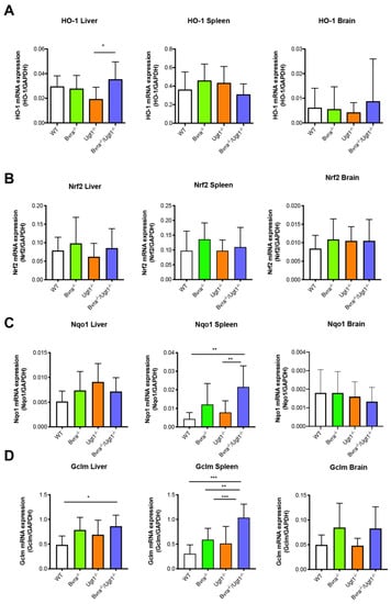 Gene expression analysis of oxidative stress markers. (A) Hmox1 (HO-1) mRNA expression levels in liver, spleen, and brain. One-way ANOVA: liver, p = 0.0283, F = 3.390, Bonferroni tests: WT vs. Bvra−/−Ugt1−/−, ns; spleen: p = 0.1705, F = 1.759, ns; brain, p = 0.8114, F = 0.3193, ns.; (B) Nfe2l2 (Nrf2) mRNA expression levels in liver, spleen, and brain. One-way ANOVA, liver: p = 0.3650, F = 1.089, NS; spleen, p = 0.3167, F = 1.215, NS; brain: p = 0.6649, F = 0.5292, NS; (C) Nqo1 mRNA expression levels in liver, spleen, and brain. One-way ANOVA, liver: p = 0.1049, F = 2.196, NS; spleen: p = 0.0009, F = 6.757, ***, Bonferroni test: WT vs. Bvra−/−Ugt1−/− p = 0.0013, **; brain: p = 0.4100, F = 0.9853, NS; (D) Gclm mRNA expression levels in liver, spleen, and brain. One-way ANOVA, liver: p = 0.0127, F = 4.085, *, Bonferroni test: WT vs. Bvra−/−Ugt1−/− p = 0.0121, *; spleen: p < 0.0001, F = 12.57; Bonferroni tests: WT vs. Bvra−/−Ugt1−/− p < 0.001, ***, Bvra−/− vs. Bvra−/−Ugt1−/− p = 0.0034, **, Ugt1−/− vs. Bvra−/−Ugt1−/− p = 0.0003, ***; brain: p = 0.0217, F = 3.612, *, Bonferroni tests: NS. Data represent the mean ± SD.